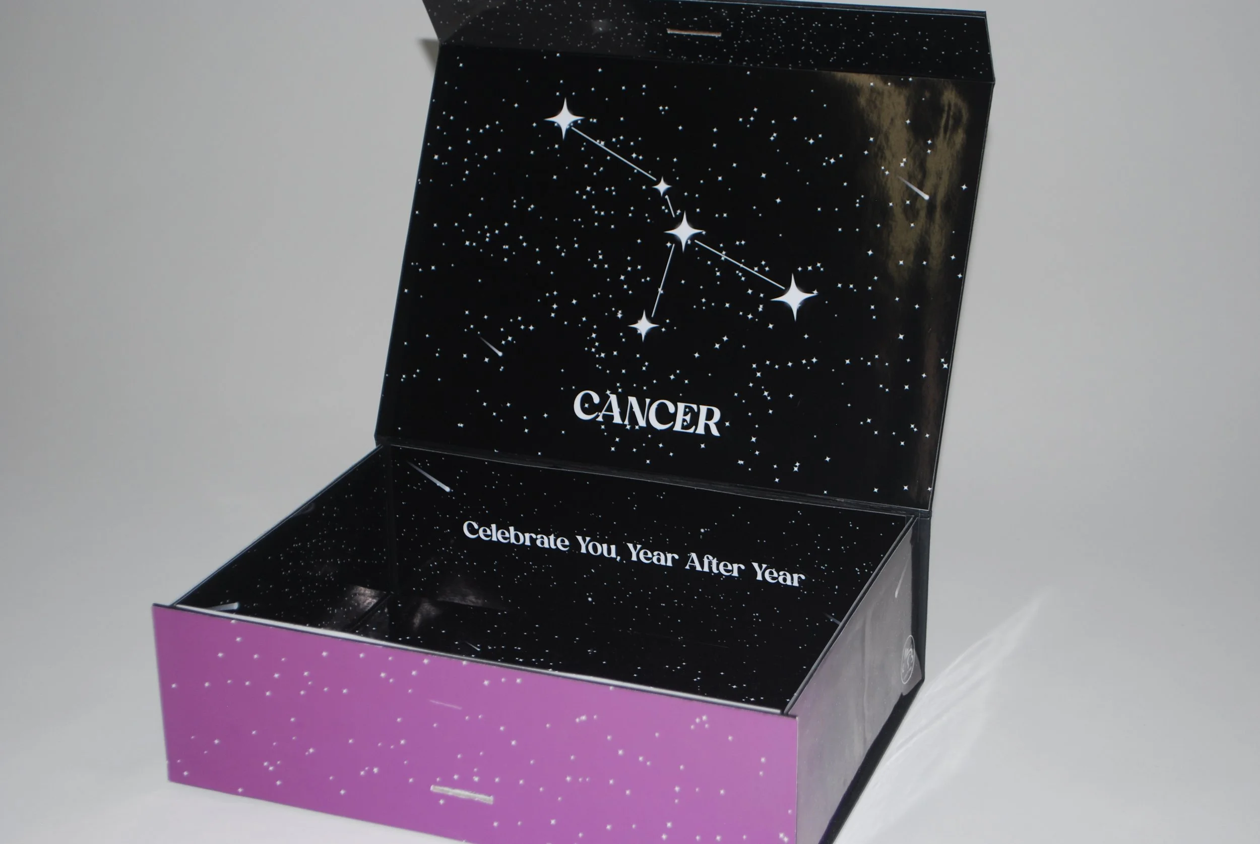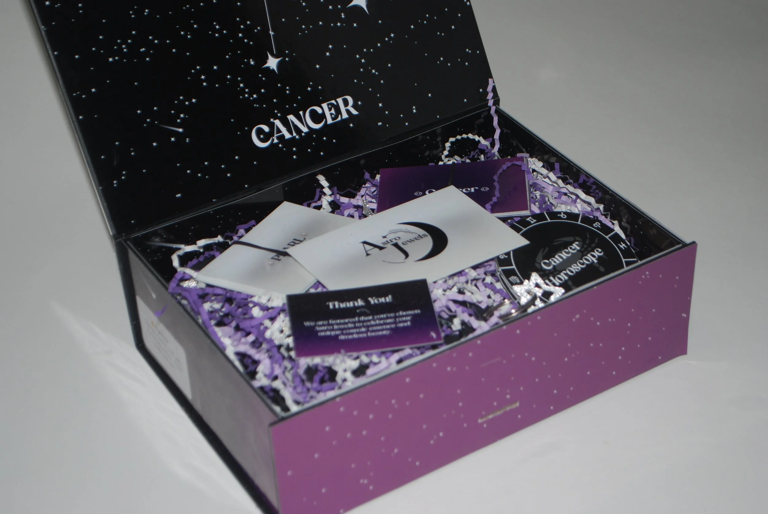 This was a project where I was tasked with creating our own brand of a subscription box. Something that I’ve always been interested in were zodiacs along with jewelry, so I wanted to combine the two to make Astro Jewels. This was a subscription box that would be mailed to you every year at the start of your birth month that included jewelry based around your zodiac sign and birthstone. I wanted for the opening of this subscription box to be an experience when opening it. Inside you’ll find birthstone and zodiac cards with information about both along with a thank you card and a zodiac horoscope booklet with information on your horoscope for the month.